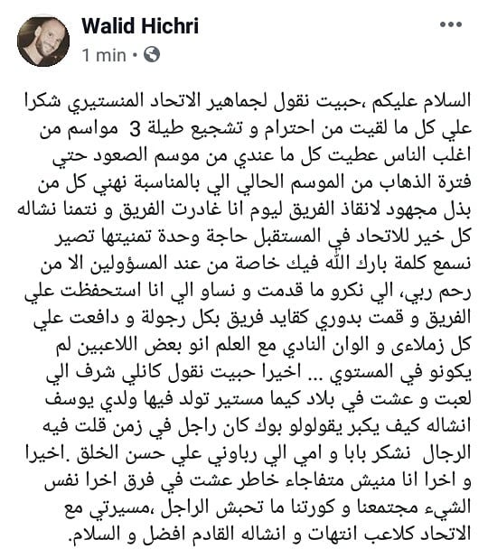 Le défenseur central Walid Hichri a annoncé son départ de l'Union Sportive Monastirienne.