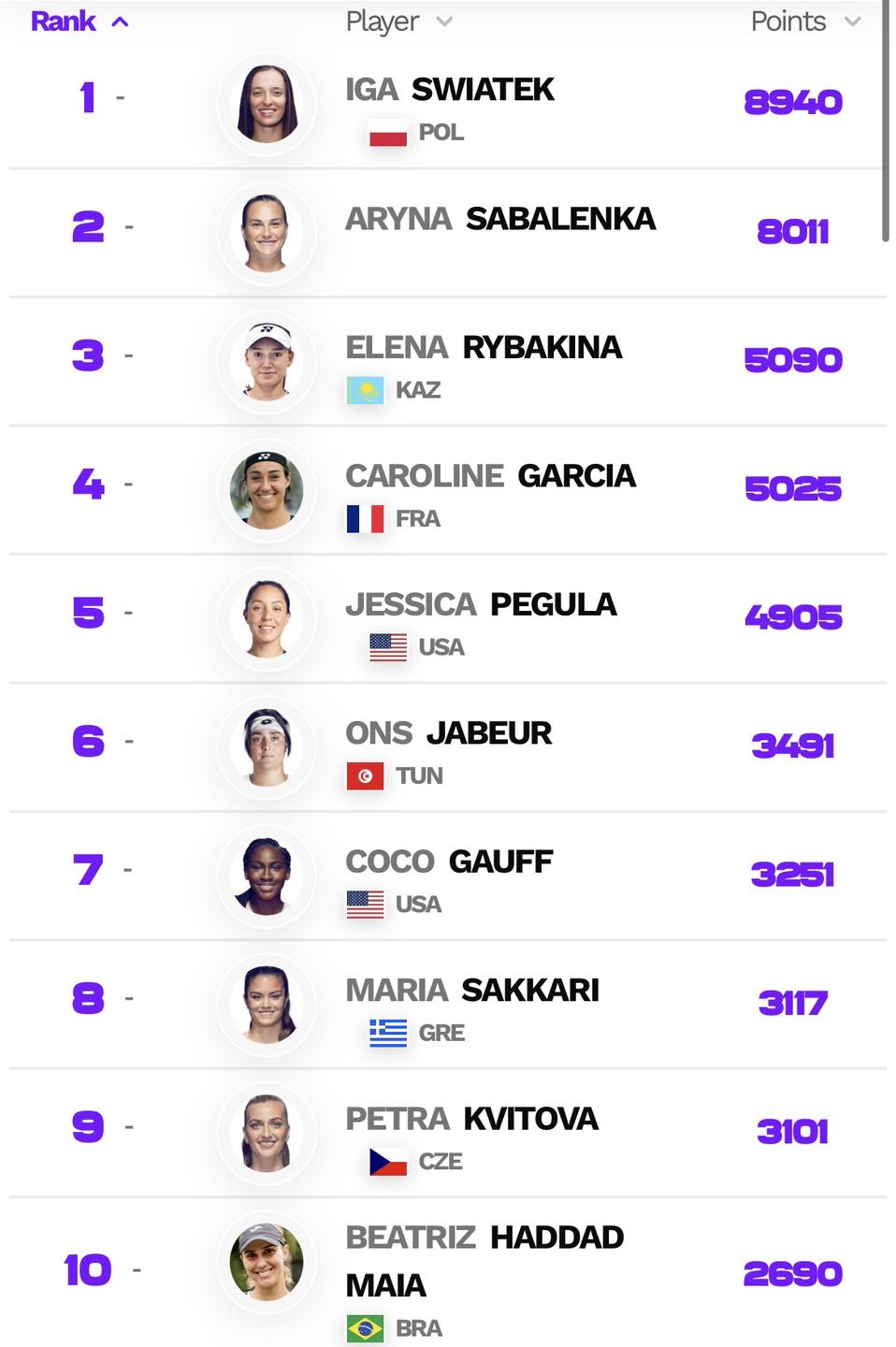 Ons Jabeur conserve ainsi sa sixième place mondiale derrière Swiatek, Sabalenka, Rybakina, Garcia et Pegula.
