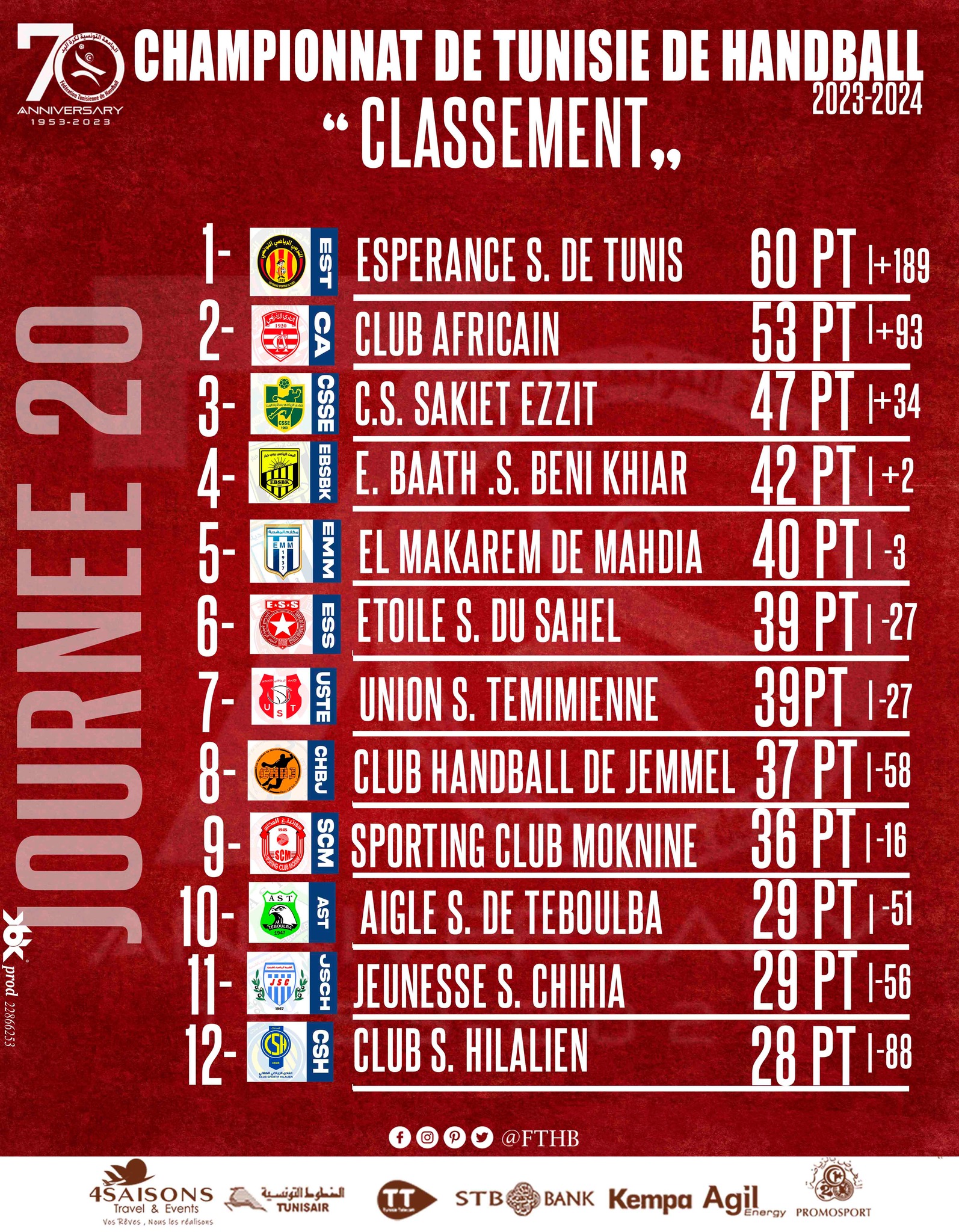 Voici le classement général du championnat de handball à l'issue de la rencontre en retard qui a opposé cet après midi l'Espérance de Tunis à l'EBS Beni Khiar (37-28) :