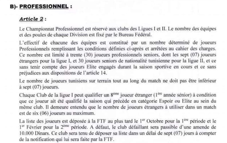 Toutefois, la Fédération Tunisienne de Football a confirmé le fait que sept joueurs tunisiens devront être présents à chaque match sur la pelouse pour chaque formation.