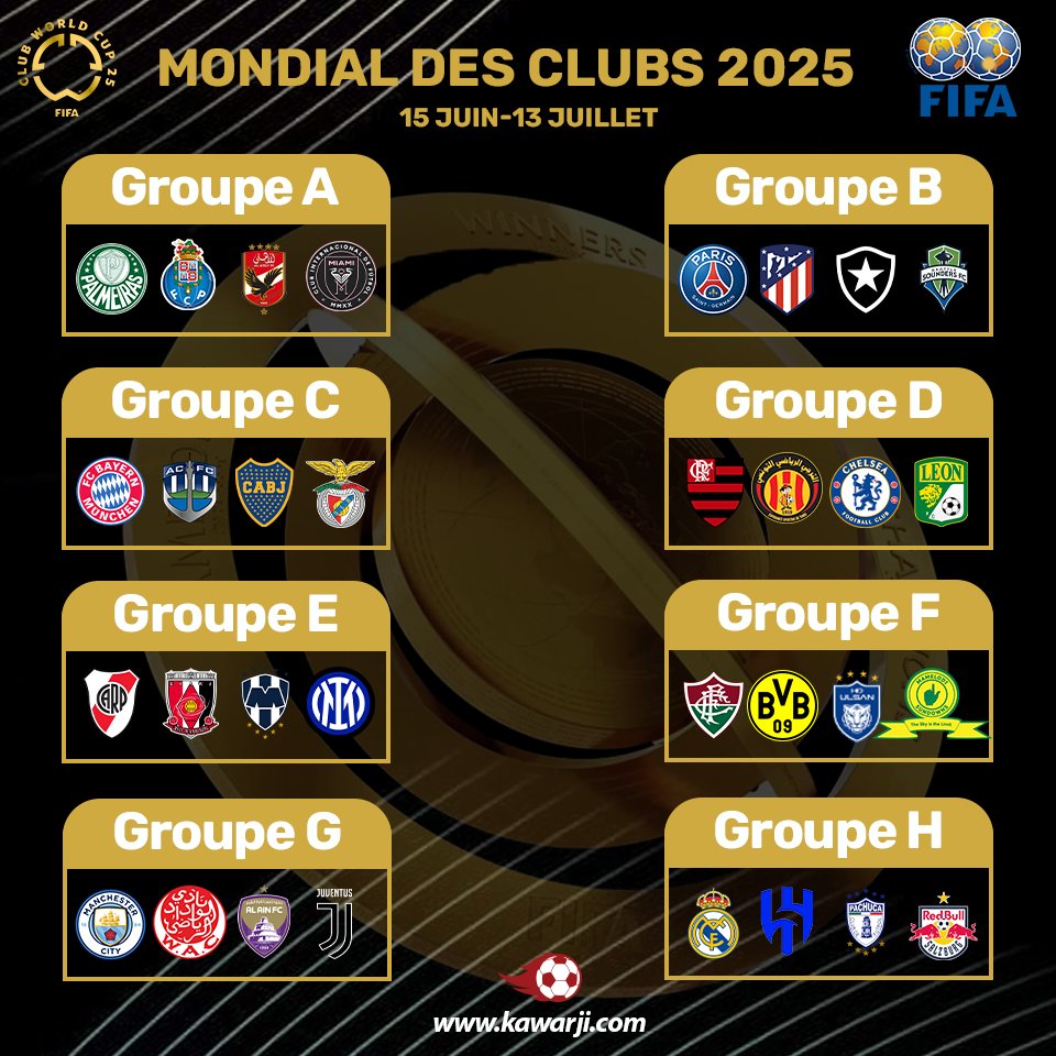 Voici la composition de tous les groupes du Mondial des Clubs 2025 qui aura lieu l'été prochain du 15 juin au 13 juillet 2025 aux Etats-Unis :