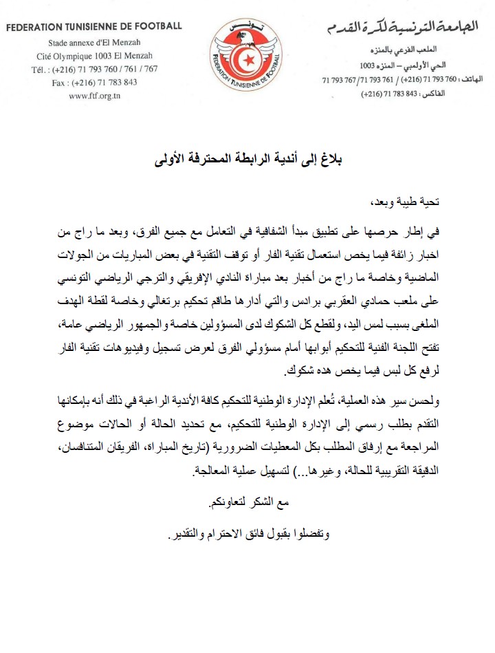 La Direction Nationale de l'Arbitrage a tenu, ce jour, à apporter plusieurs précisions concernant l’utilisation de la technologie de l’assistance vidéo à l’arbitrage (VAR) dans le cadre du championnat de Ligue 1.