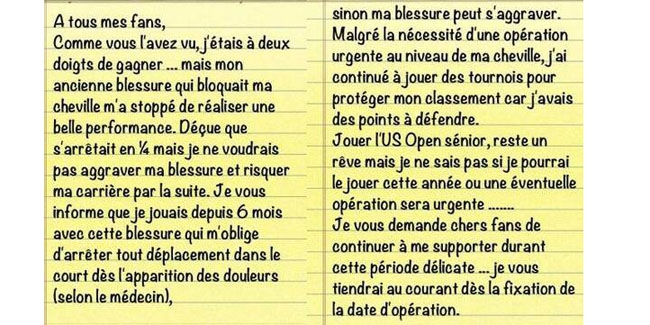 Ons Jabeur a tenu ? clarifier ? ses fans aujourd'hui via son compte facebook les raisons exactes de son abandon du tournoi de Baku.