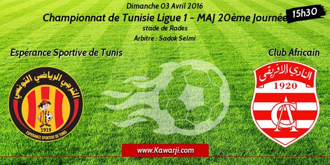 Suivez avec nous à partir de 15h30 l'évolution du score du derby de la capitale qui opposera l'Espérance Sportive de Tunis au Club Africain :
