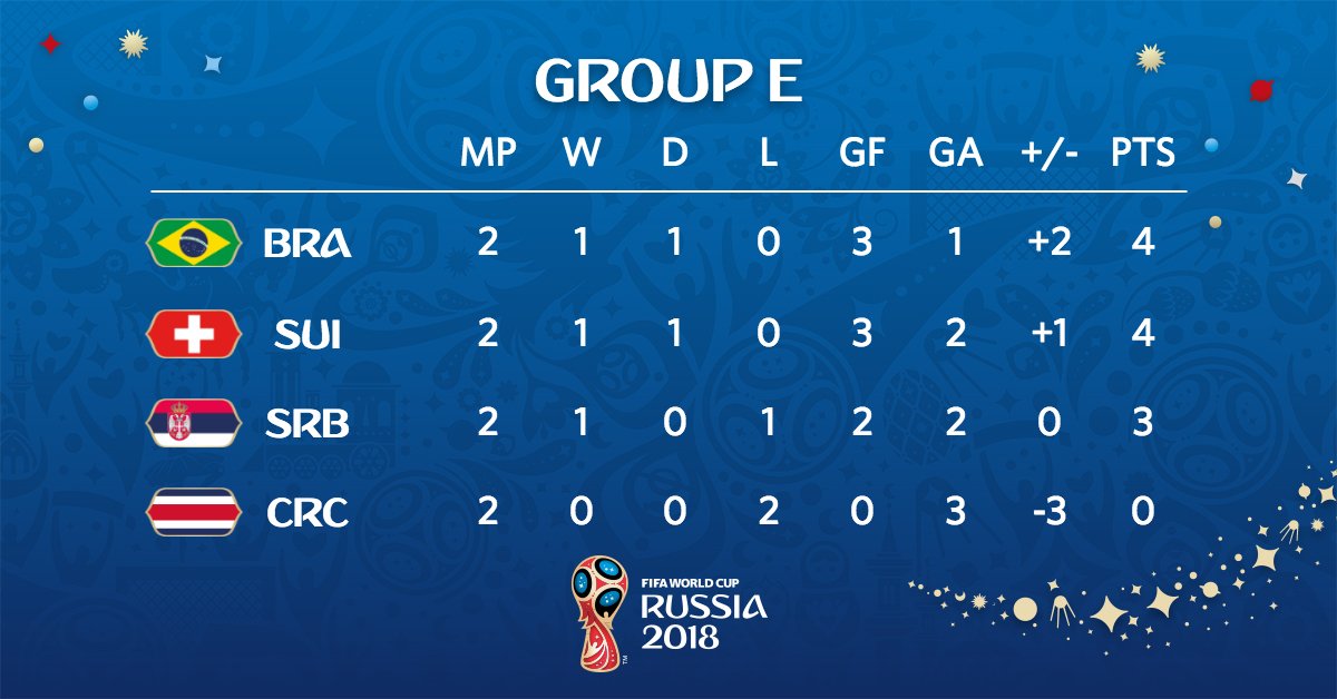 Classement : Brésil 4 pts (2 m, +2), Suisse 4 pts (2 m, +1), Serbie 3 pts (2 m, 0), Costa Rica 0 pt (2 m, -3)