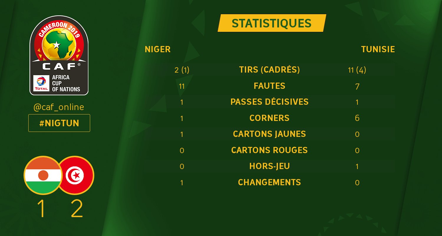 Suivez avec nous sur Kawarji à partir de 16h00 l'évolution du score de la rencontre des éliminatoires de la Coupe d'Afrique des Nations 2019 qui opposera le Niger à la Tunisie :