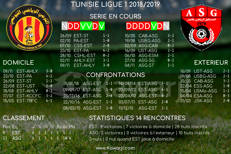 Ligue 1 2018-2019 - MAJ 5ème journée : Historique des confrontations pour le match Espérance de Tunis - AS Gabés
