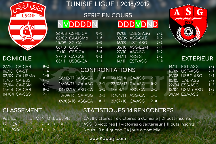 Avant la rencontre prévue ce vendredi après midi pour le compte de la 8ème journée de la Ligue 1 tunisienne 2018-2019, voici l'historique et les statistiques relatifs à cette confrontation entre le Club Africain et l'AS Gabés :
