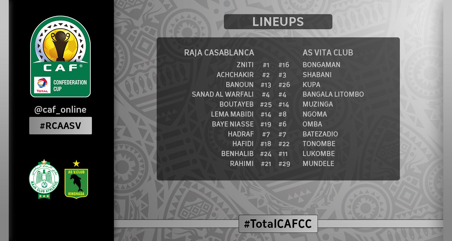Suivez avec nous sur Kawarji à partir de 20h00 l'évolution du score de la finale aller de la Coupe de la Confédération qui opposera le Raja Casablanca à l'AS Vita Club :