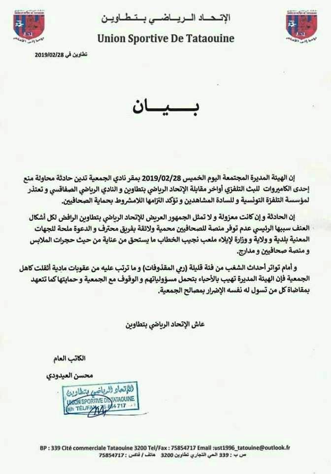 Le comité directeur de l'US Tataouine appelle à cette occasion les instances régionales à aménager une nouvelle tribune de presse qui puisse dans le futur éviter de tels débordements.