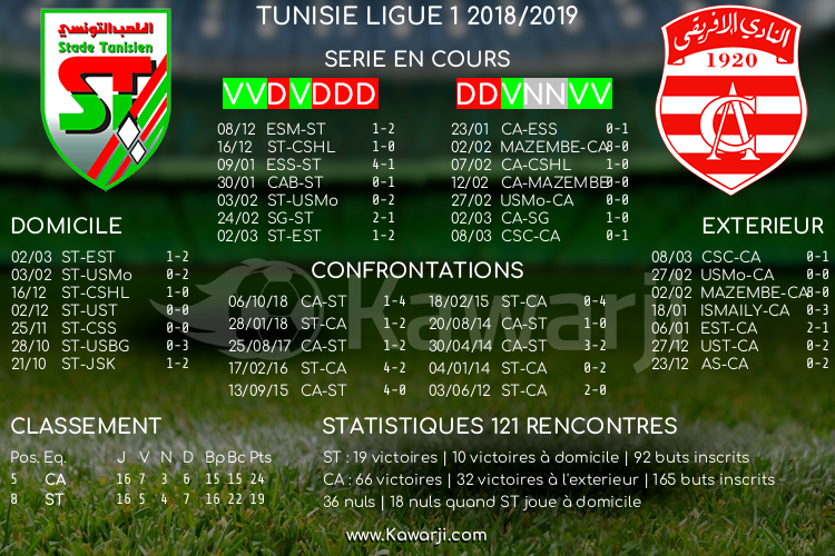 Avant la rencontre prévue ce samedi entre le Stade Tunisien et le Club Africain pour le compte de la 17ème journée de la Ligue 1 tunisienne 2018-2019, voici l'historique et les statistiques relatifs à cette confrontation :