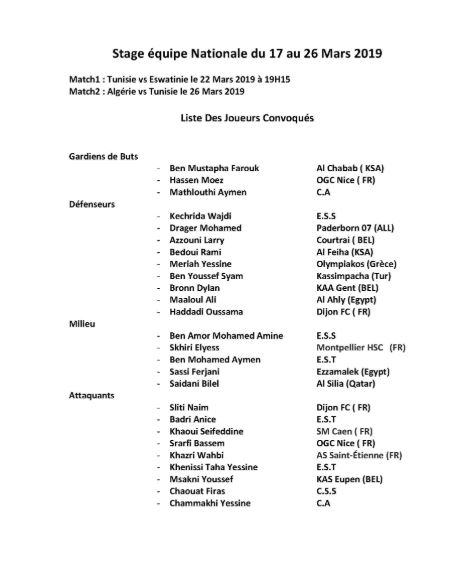 La sélection tunisienne disputera un match face à l'Eswatini le 22 mars prochain au stade de Rades pour le compte de la dernière journée des éliminatoires de la Coupe d'Afrique des Nations 2019 avant de se déplacer à Alger en vue d'affronter en amical la sélection algérienne le 26 mars.