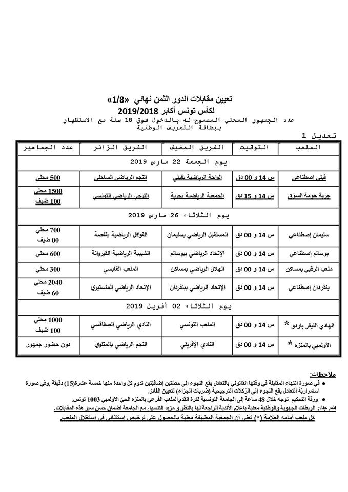 La Fédération Tunisienne de Football a apporté aujourd'hui un léger changement à l'horaire de la rencontre des huitièmes de finale de la Coupe de Tunisie qui opposera l'AS Djerba à l'Espérance Sportive de Tunis.