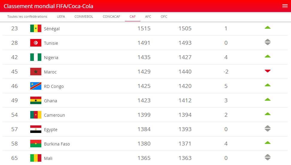 Derrière la sélection tunisienne, le top cinq africain est complété par le Nigeria (42ème, +4), le Maroc (45ème, -2) et la RD Congo (46ème, +5).