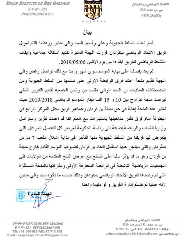 Le comité directeur de l'US Ben Guerdene a annoncé aujourd'hui sa démission.