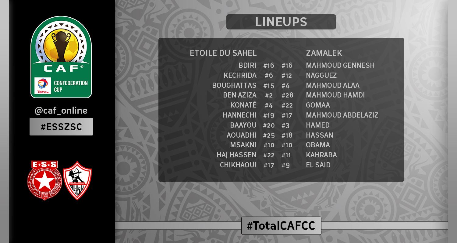 Suivez avec nous sur Kawarji ce dimanche à partir de 20h00 l'évolution du score de la demi-finale retour de la Coupe de la Confédération 2018-2019 qui opposera l'Etoile Sportive du Sahel au Zamalek :