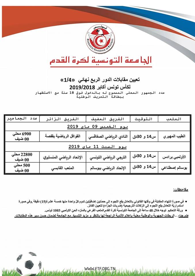 La Fédération Tunisienne de Football a communiqué ce lundi le nombre de supporters autorisés durant les trois premiers matches des quarts de finale de la Coupe de Tunisie 2018-2019 qui auront lieu cette semaine :