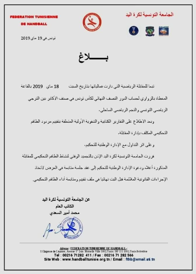 La Fédération Tunisienne de Handball a décidé aujourd'hui de geler provisoirement les activités des arbitres qui ont dirigé hier soir la demi-finale de la Coupe de Tunisie de handball entre l'Espérance Sportive de Tunis et l'Etoile Sportive du Sahel.