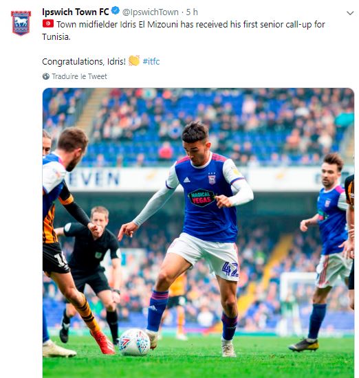 Le club d'Ipswich Town a annoncé aujourd'hui la convocation de l'un de ses joueurs en sélection tunisienne.