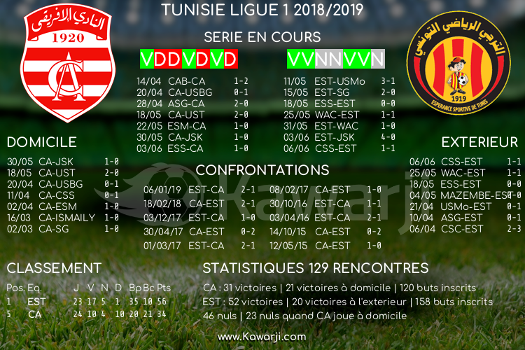 Avant le match prévu ce dimanche pour le compte de la 24ème journée de la Ligue 1 tunisienne 2018-2019 entre le Club Africain et l'Espérance de Tunis, voici l'historique et les statistiques relatifs à cette confrontation en championnat :