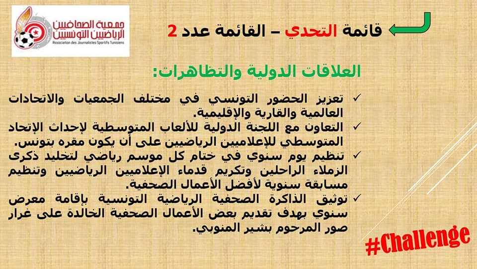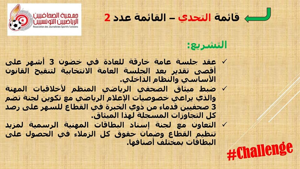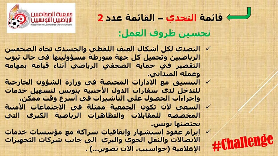 *مطالبة الاندية و الجامعات بمزيد من الشفافية في ما يتعلق بمنح شارات الدخول الى الملاعب و القاعات و كل التظاهرات التي تشرف عليها من اجل ضمان عدم مصادرة حق الصحفي الرياضي في ظروف عمل ملائمة.