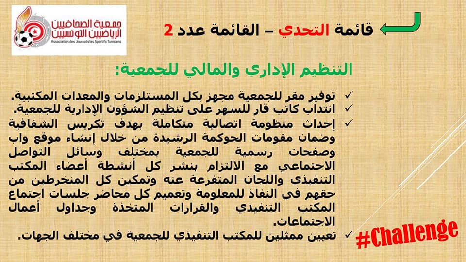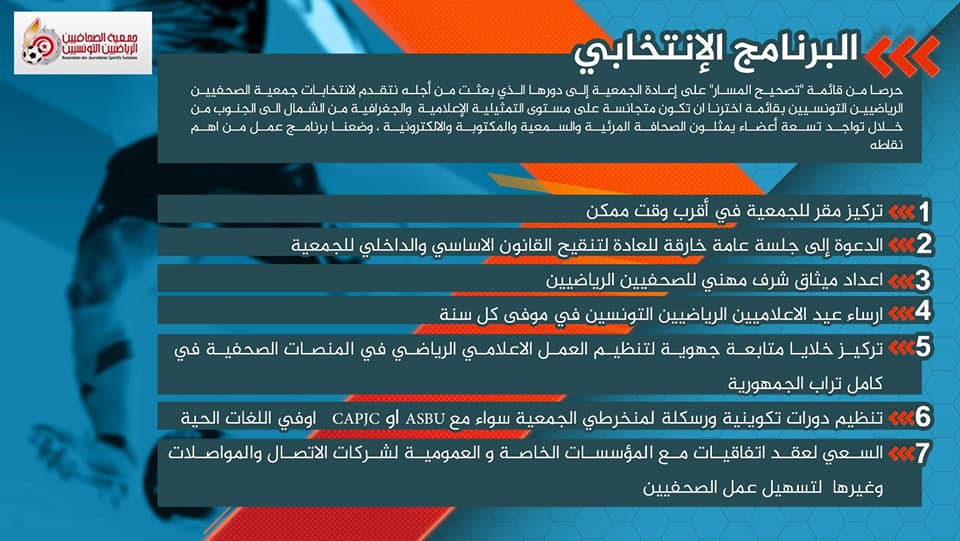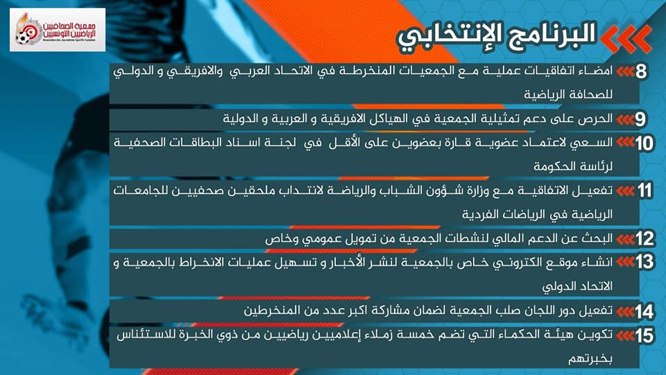 *العمل على تنقيح القانون الاساسي للجمعية بشكل يضمن أولا و بالذات تغليب مصلحة الصحفي الرياضي و خدمة القطاع بالدرجة الاولى .