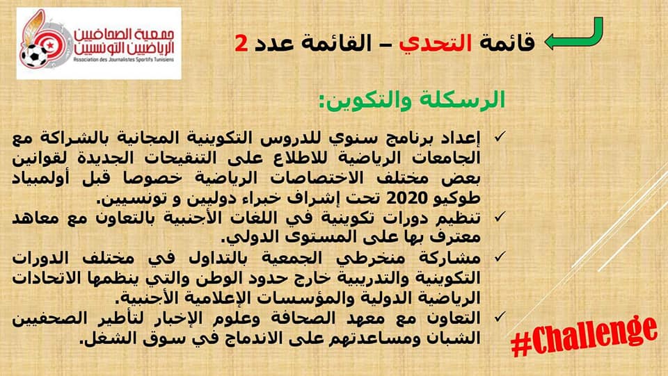 *تأمين فرصة المشاركة في تربصات و دورات تكوينية داخلية و خارجية على مستوى الصحافة الرياضية .
