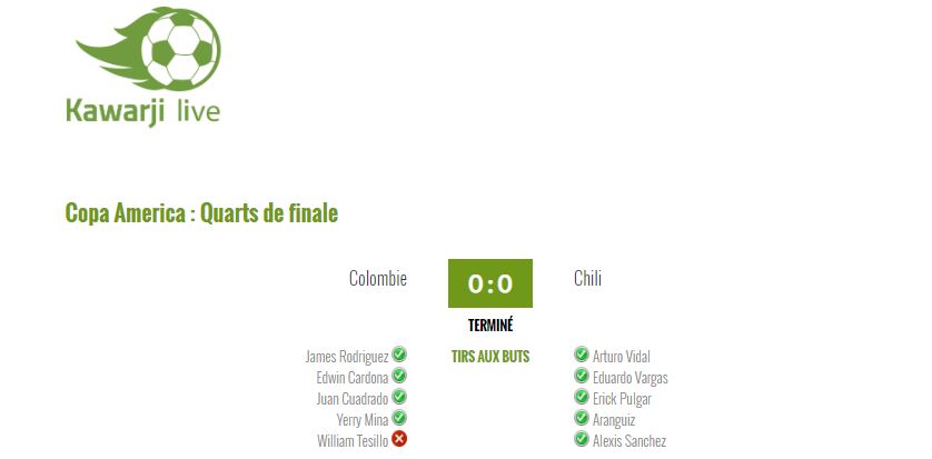Suivez avec nous sur Kawarji à partir de 00h00 l'évolution du score de la rencontre des quarts de finale de la Copa America 2019 qui opposera la Colombie au Chili :