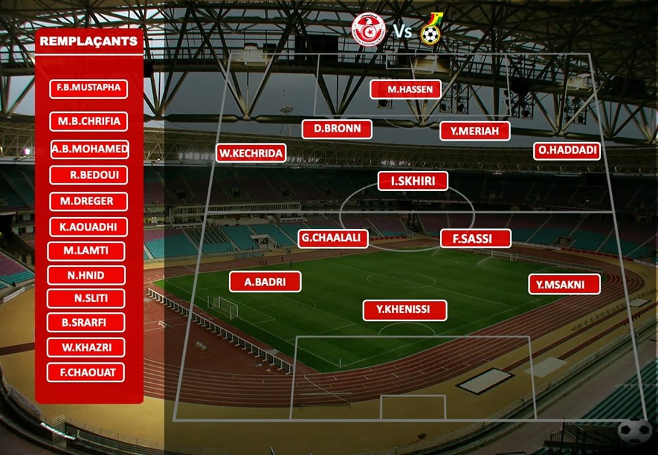 Mouez Hassen, Wajdi Kechrida, Dylan Bronn, Yassine Meriah, Oussema Haddadi, Ellyes Skhiri, Ghailane Chaalali, Ferjani Sassi, Anice Badri, Youssef Msakni, Taha Yassine Khenissi.