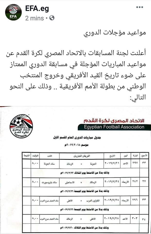 Quatre matches du championnat égyptien n'ont pas encore été disputés et devaient l'être à la fin de ce mois de juillet selon le programme suivant :