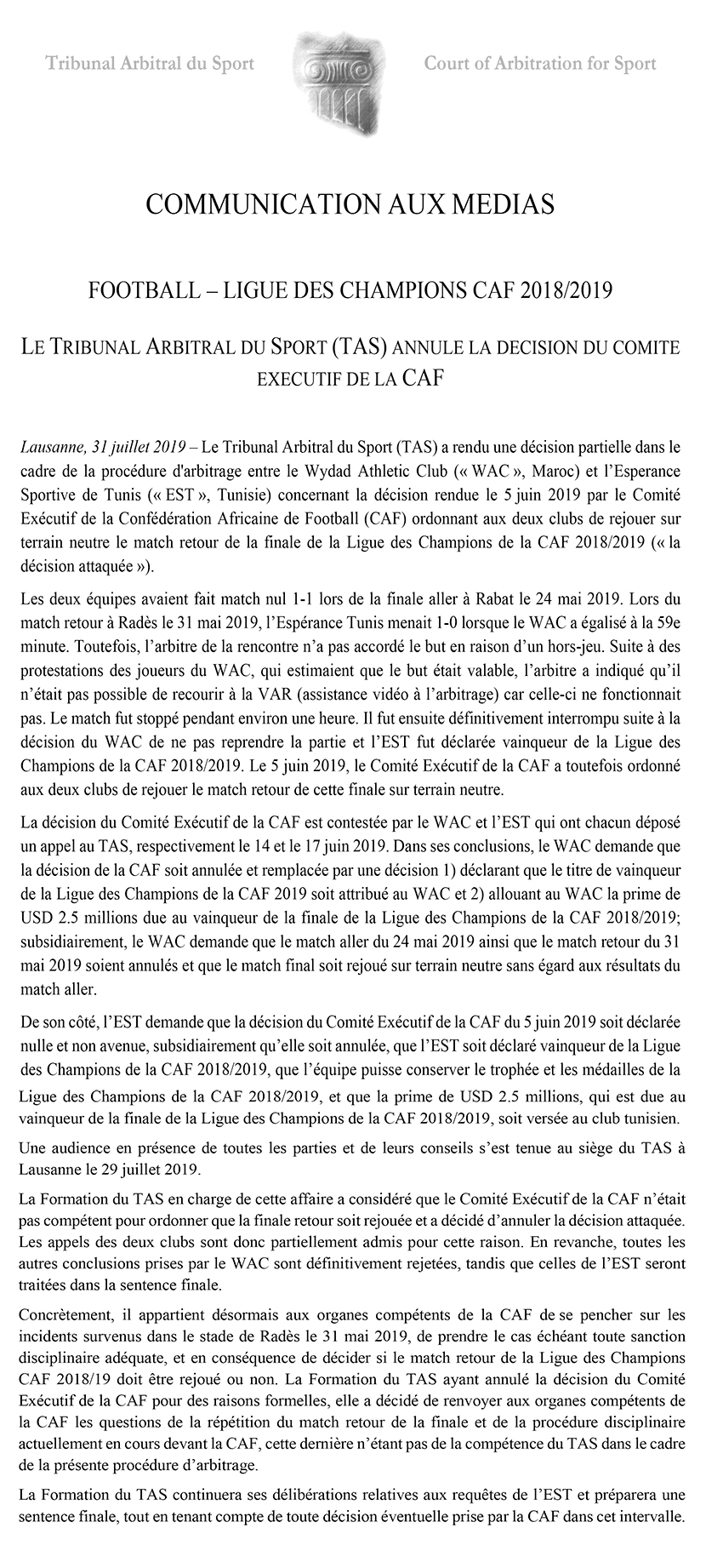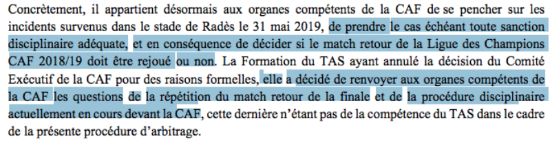 Le Tribunal Arbitral du Sport a fini aujourd'hui par annoncer son verdict tant attendu au sujet de la finale retour de la Ligue des Champions africaine 2018-2019.