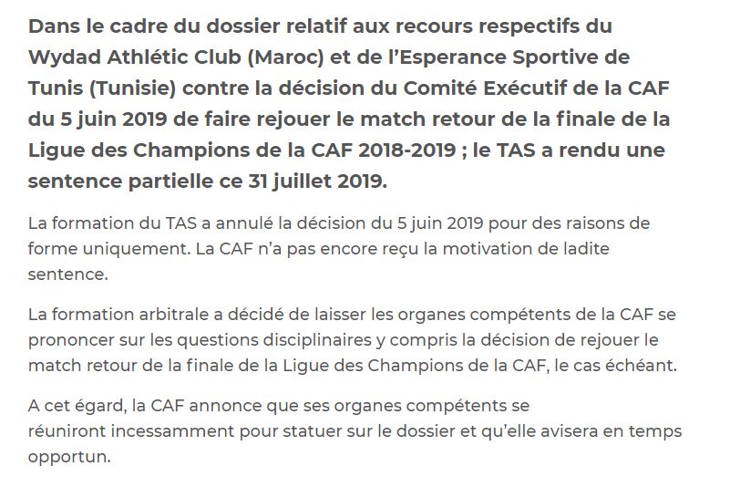 La Confédération Africaine de Football a enfin décidé de réagir après la décision du Tribunal Arbitral du Sport au sujet de la finale retour de la Ligue des Champions africaine 2018-2019.