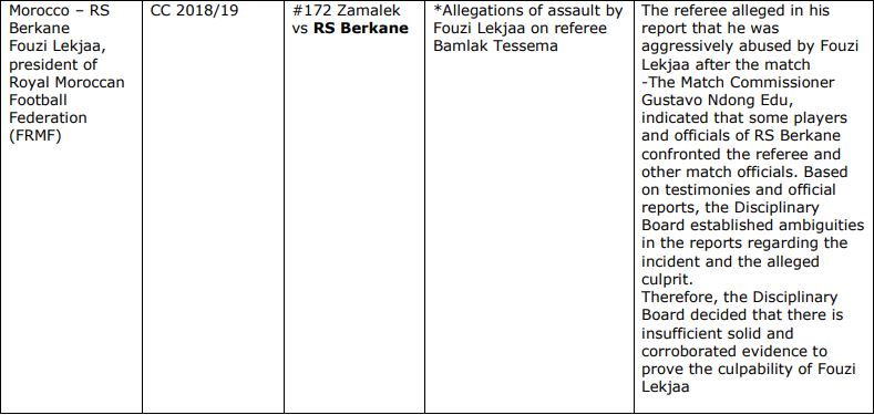 Face à cette ambigüité et l'absence d'identification nette, la commission de discipline de la Confédération Africaine de Football a décidé qu'il n'y avait pas de bases solides pour sanctionner Fouzi Lekjaa.