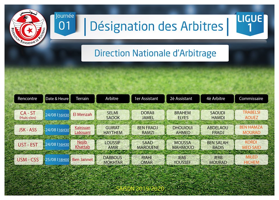 La Direction Nationale d'Arbitrage a communiqué les noms des arbitres qui dirigeront ce weekend les quatre premiers matches pour le compte de la première journée du championnat tunisien de Ligue 1 2019-2020.