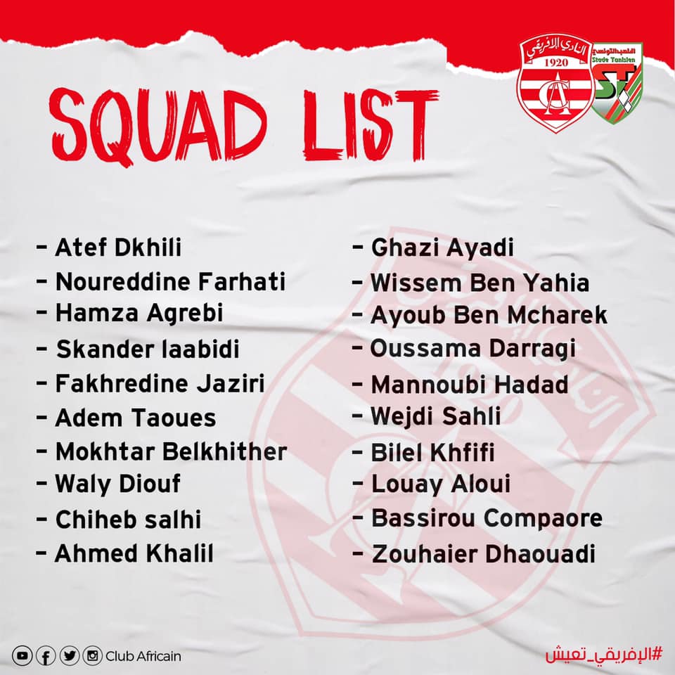 Le staff technique du Club Africain a communiqué la liste des joueurs convoqués pour affronter le Stade Tunisien demain en ouverture du championnat de Ligue 1 pour la saison 2019-2020.