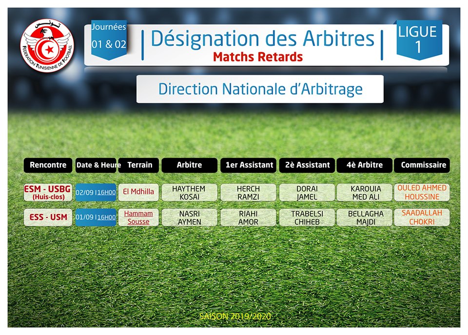 La direction Nationale d'Arbitrage a communiqué aujourd'hui les noms des arbitres qui dirigeront les deux matches en retard des première et deuxième journées de la Ligue 1 tunisienne 2019-2020.