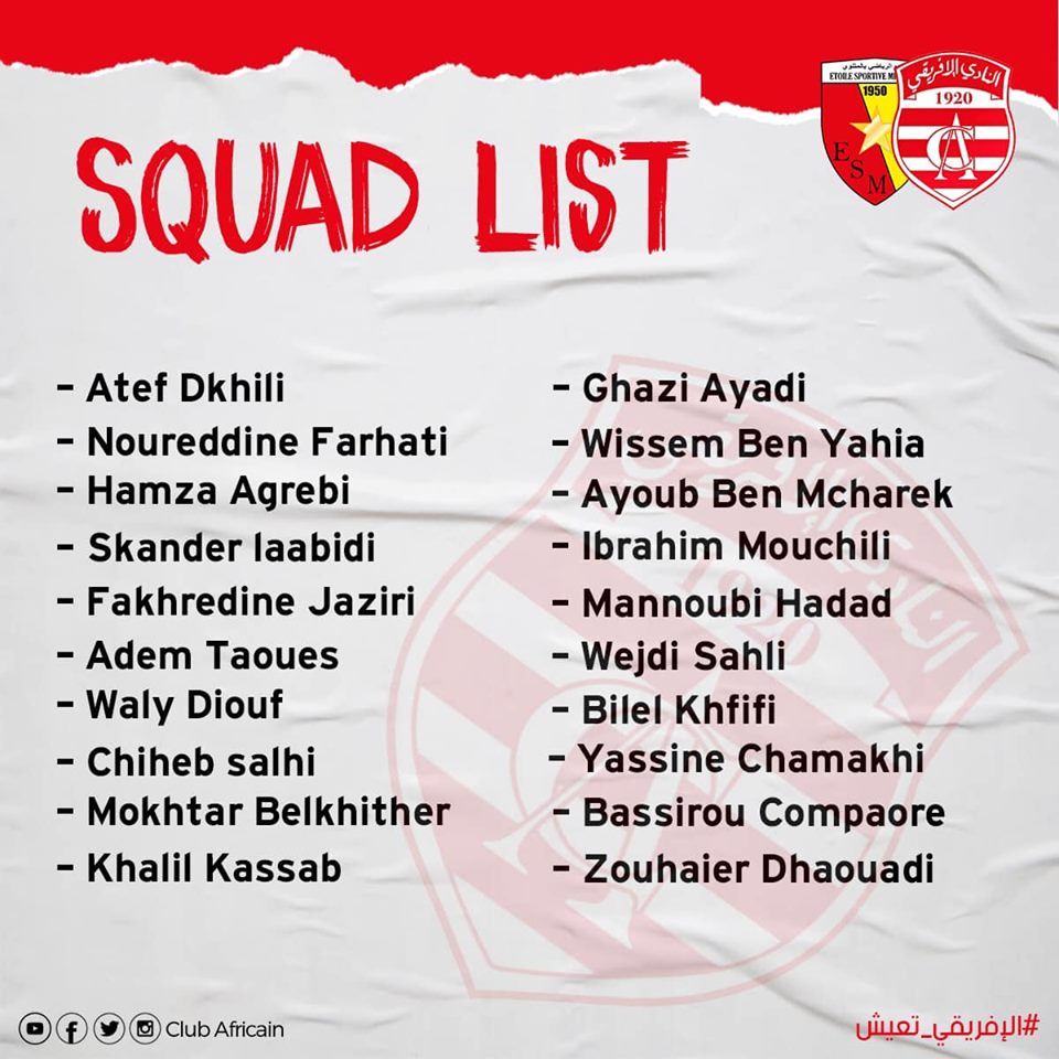 Liste des joueurs du Club Africain pour affronter l'ES Métlaoui