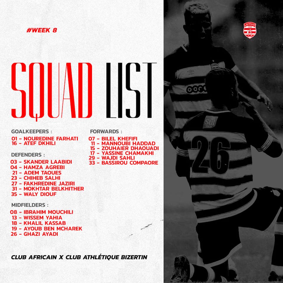 Le staff technique du Club Africain a communiqué la liste des joueurs convoqués pour affronter ce dimanche le Club Athlétique Bizertin pour le compte de la huitième journée du championnat de Ligue 1 2019-2020.