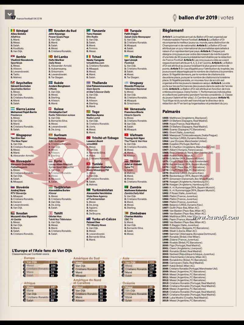 Le magazine France Football a communiqué le détail des votes par pays pour la désignation du Ballon d'Or 2019.