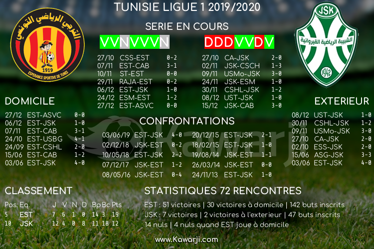 Avant le match en retard prévu ce mardi entre l'Espérance de Tunis et la JS Kairouanaise pour le compte de la 13ème journée de la Ligue 1 tunisienne 2019-2020, voici l'historique et les statistiques relatifs à cette confrontation :