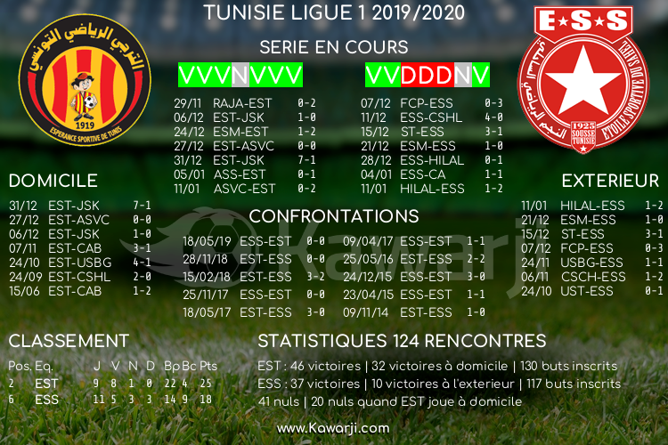 Avant le match en retard prévu ce mercredi entre l'Espérance de Tunis et l'Etoile du Sahel pour le compte de la 7ème journée de la Ligue 1 tunisienne 2019-2020, voici l'historique et les statistiques relatifs à cette confrontation :