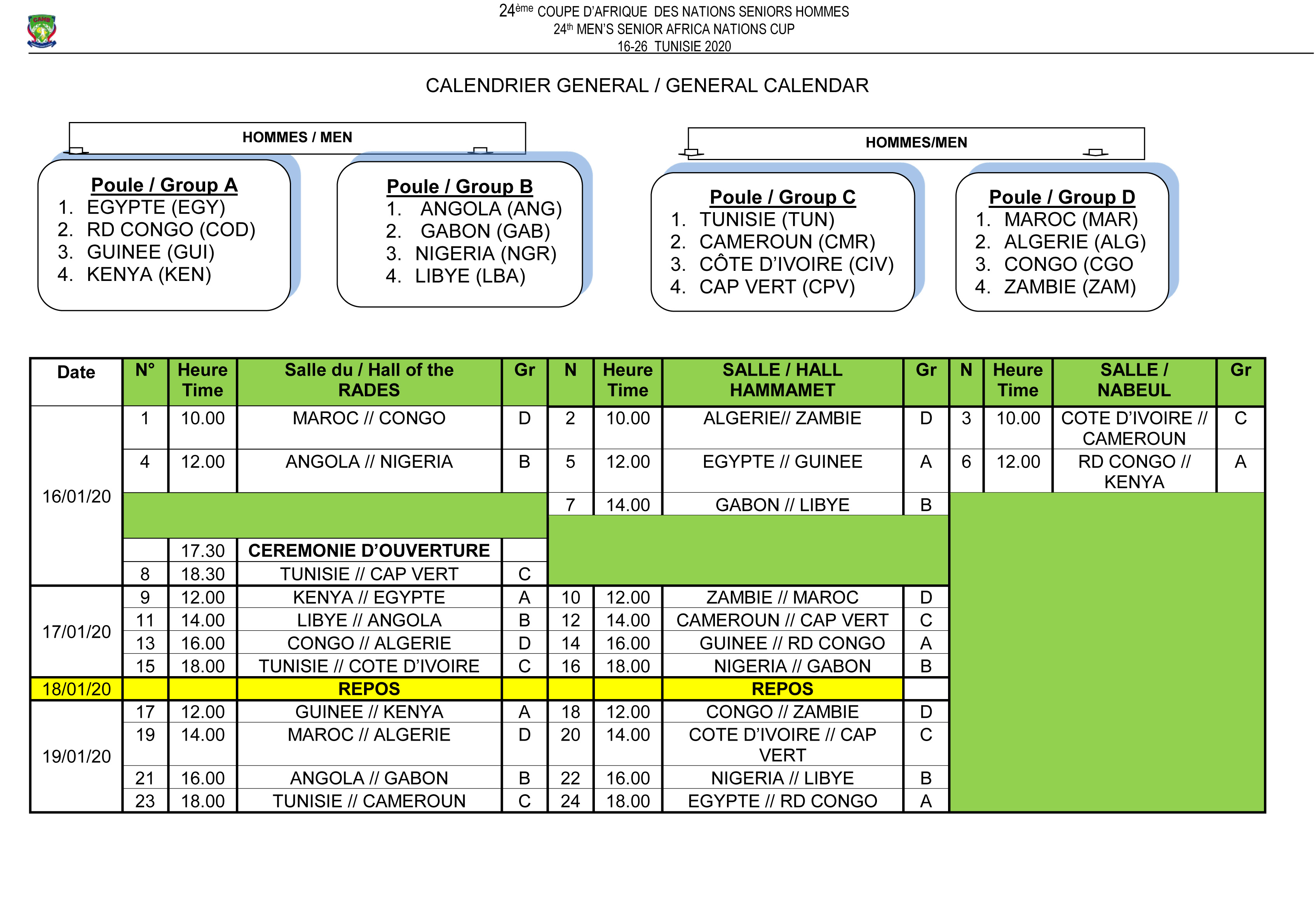 19 janvier : Tunisie 18h00 Cameroun