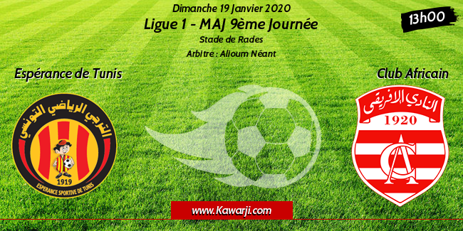 Suivez avec nous sur Kawarji ce dimanche à partir de 13h00 l'évolution du score de la rencontre de la 9ème journée de la Ligue 1 qui opposera l'Espérance de Tunis au Club Africain :