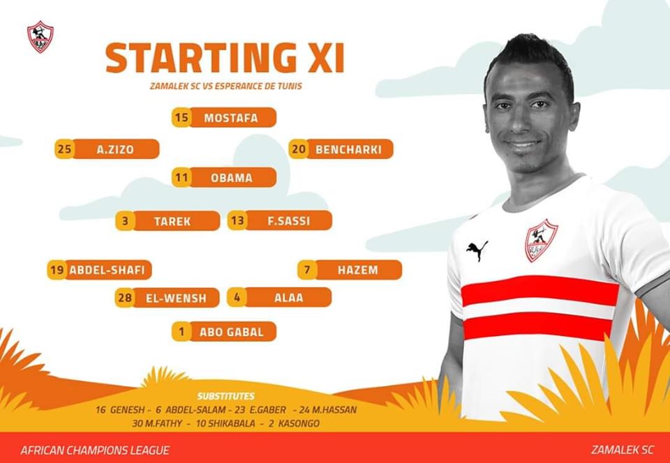 Voici la formation rentrante des égyptiens du Zamalek qui affronteront ce vendredi soir l'Espérance Sportive de Tunis en en quarts de finale retour de la Ligue des Champions africaine 2019-2020 :