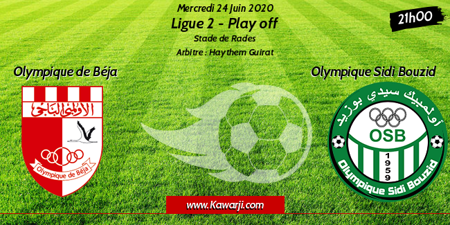 Suivez avec nous sur Kawarji à partir de 21h00 un live score de la rencontre de play-off au groupe A de la Ligue 2 qui opposera l'Olympique de Béja à l'Olympique Sidi Bouzid :