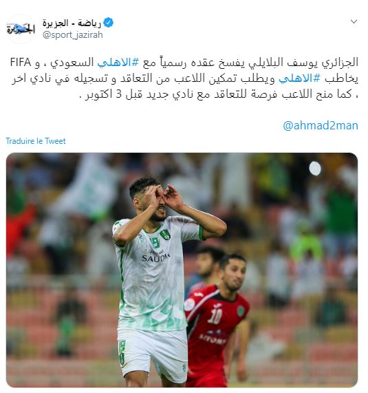 L'international algérien Youssef Belaili aurait obtenu la résiliation de son contrat avec la formation saoudienne d'Al Ahli Djeddah.