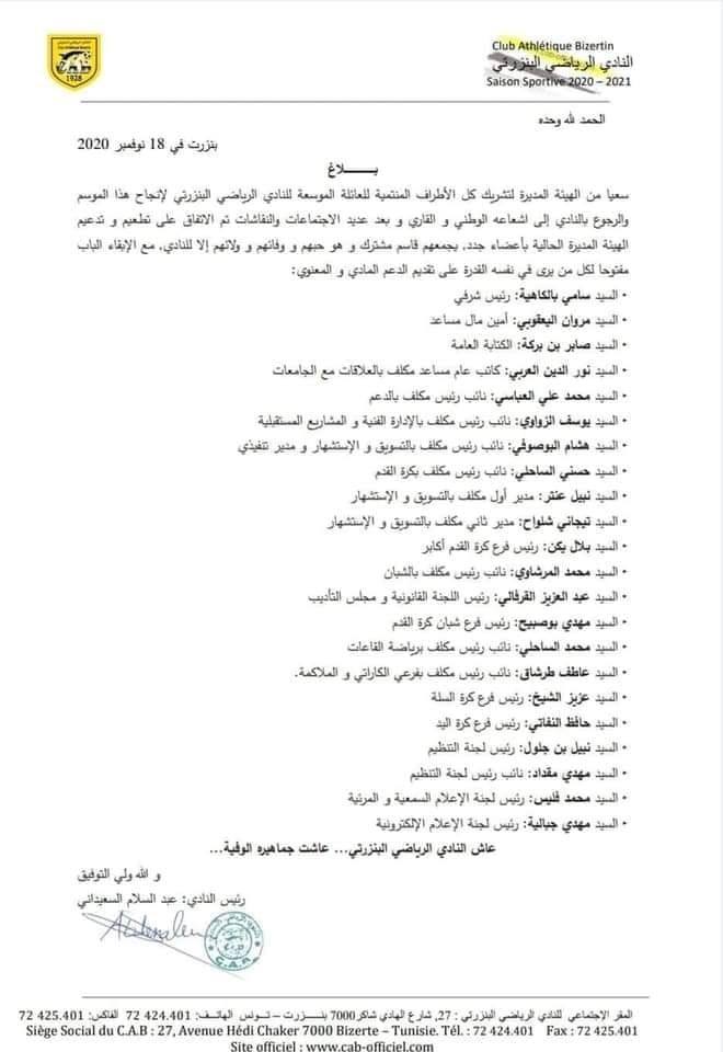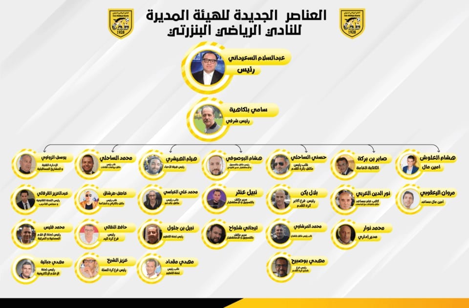 Le président du Club Athlétique Bizertin Abdessalem Saidani a communiqué aujourd'hui la composition de son équipe administrative pour cette saison.