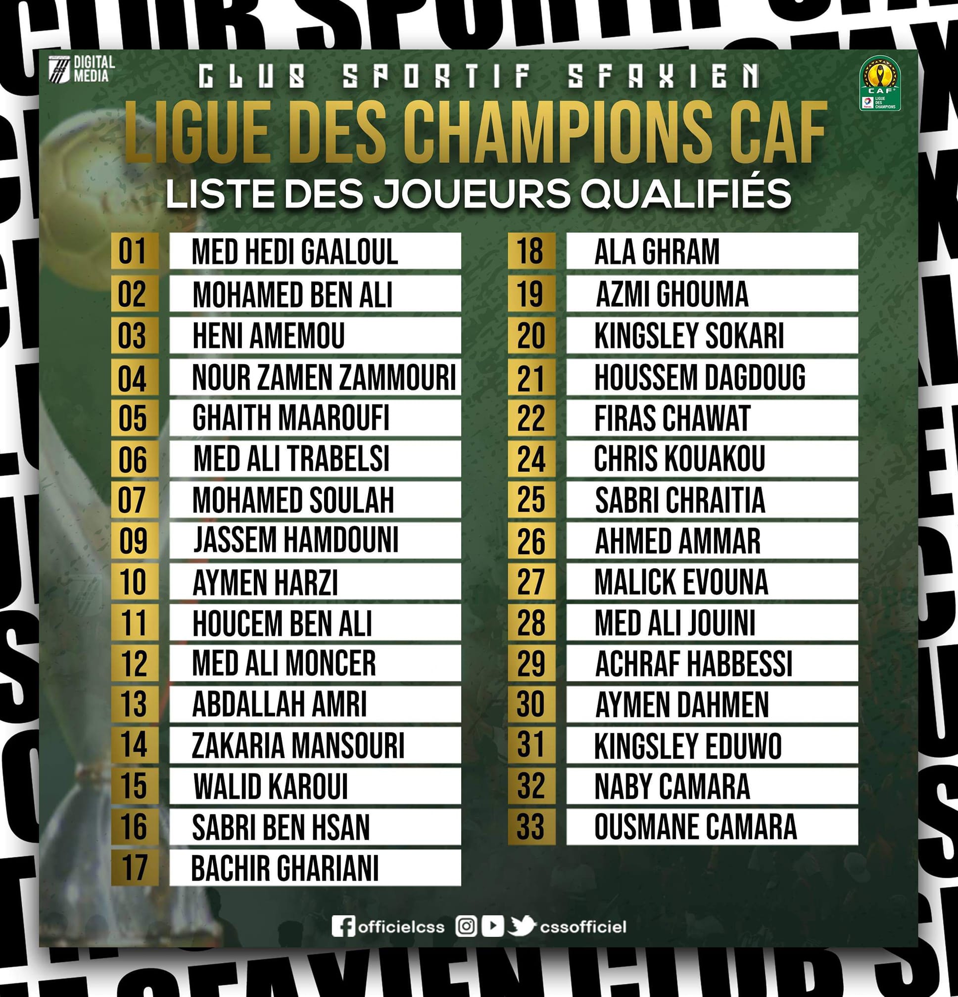 Le Club Sportif Sfaxien a envoyé à la Confédération Africaine de Football la liste des joueurs appelés à disputer la Ligue des Champions la saison prochaine.