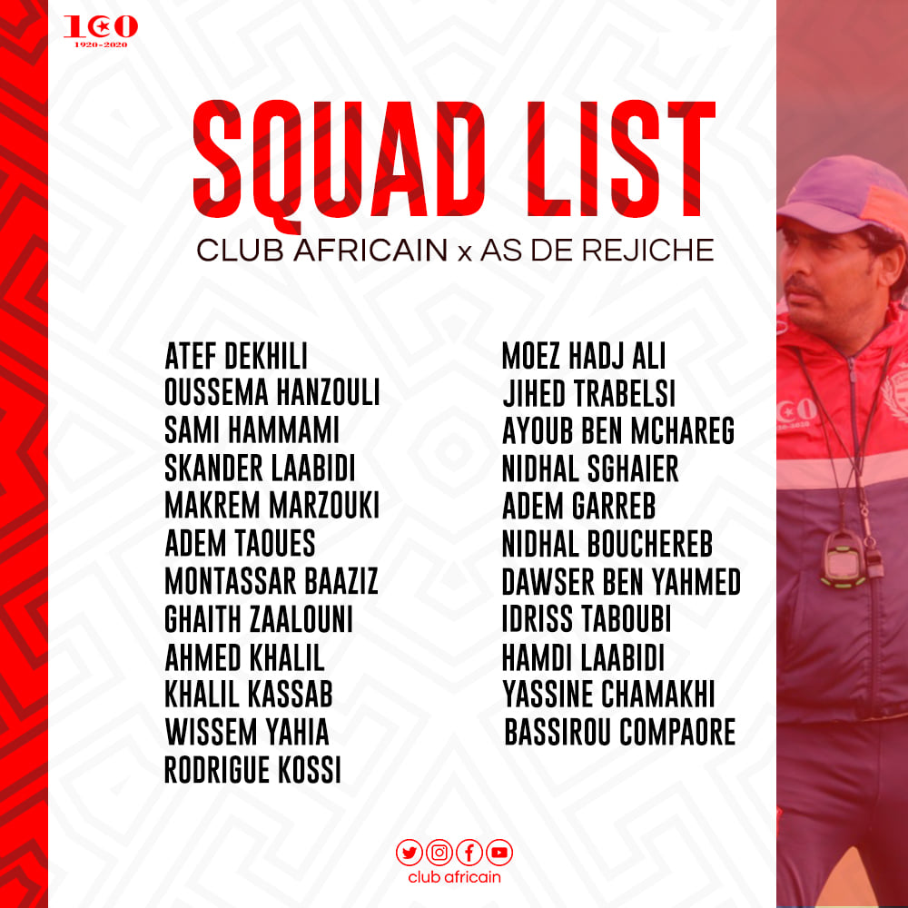 Le Club Africain a communiqué la liste des joueurs convoqués pour disputer la rencontre la 2ème journée de Ligue 1 qui aura lieu ce samedi face à l'AS Rejiche.