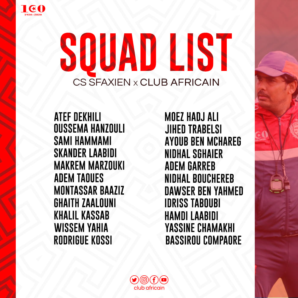 Le Club Africain a communiqué la liste des joueurs convoqués pour disputer la rencontre de la 3ème journée de Ligue 1 qui aura lieu ce samedi face au Club Sportif Sfaxien.